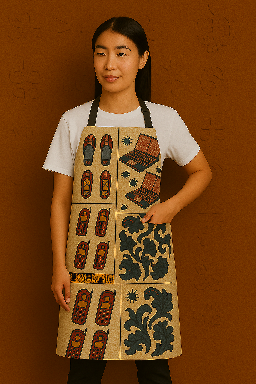 Vous pensiez que l’art africain était figé dans le passé ? Détrompez-vous. Ce tablier africain “Fusion Contemporaine” révolutionne votre vision : sandales traditionnelles côtoient tablettes de chocolat artisanal, téléphones vintage dialoguent avec motifs végétaux ancestraux…