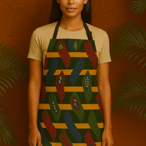 Cette tablier imprimé africain célèbre l’évolution créative du continent. Sur ce fond ocre chaleureux, chaque élément raconte l’histoire d’une Afrique qui honore ses racines tout en embrassant la modernité. Les motifs floraux stylisés dansent avec les objets du quotidien dans une harmonie parfaite.