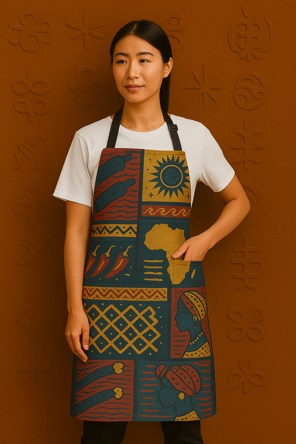 Chaque motif gravé sur ce tablier imprimé africain porte une signification profonde : force, unité, héritage. Les couleurs terre d’ocre, rouge brique et vert forêt évoquent les paysages de votre patrimoine.