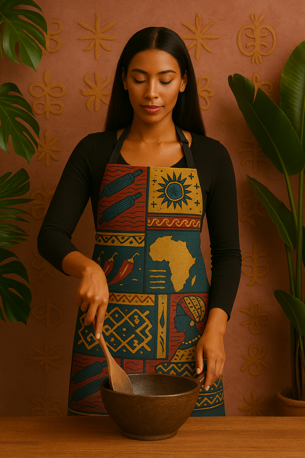 Ce tablier africain transforme chaque moment culinaire en célébration de vos racines. Orné de symboles Adinkra authentiques et de la silhouette sacrée du continent, il raconte l’histoire millénaire de la sagesse culinaire africaine.